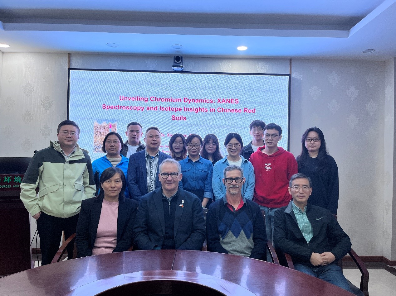 10月23日上午,Marc F. Benedetti教授做了题为“Unveiling Chromium Dynamics: XANES Spectroscopy and Isotope Insights in Chinese Red Soils”的报告,报告围绕铬(Cr)、铁(Fe)和锰(Mn)在中国南方富含铁锰结核红壤中的形态转化特征,揭示了农田环境中Cr(III)和Cr(VI)的转化伴随着Cr同位素分馏、Cr同位素(δ53Cr)可用于示踪地表环境中Cr的循环过程。Marc F. Benedetti教授利用同步辐射光谱(XANES)和稳定同位素等技术揭示了结核中铬的主要存在形态为Cr(III)-Fe(III)共沉淀物,铁主要以针铁矿和磁铁矿的形态存在,锰形态主要为锰(III)氢氧化物和有机配合物。Marc F. Benedetti表示农田环境中铁氧化物、锰氧化物形态的变化可诱导不溶态Cr(III)转化为可溶态Cr(VI),并进一步迁移至地下水造成污染风险。参会老师、同学们就铁锰矿物结构变化和吸附性能等方面进行了热烈讨论和交流。此外,Marc F. Benedetti表示,关注研究前沿、加强不同领域间的合作,并积极与同行进行交流,才可做出有意思的研究。