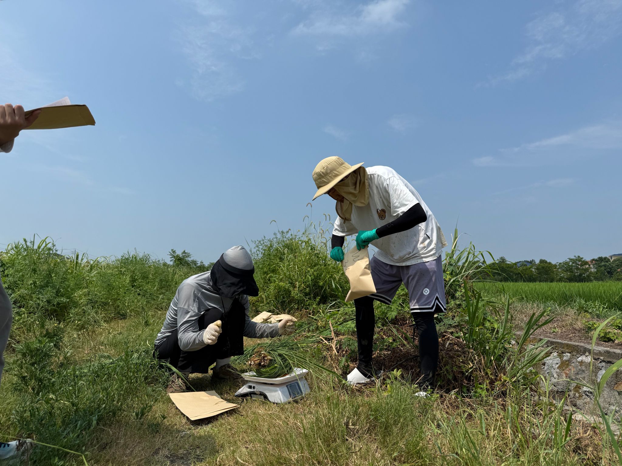 实践期间,实践团队按照科研规范进入修复示范样地,开展了水稻样品采集工作。为全面评估锰基钝化技术的修复效果,团队成员采用"五点取样法"进行科学采样——在每块标准试验小区内,分别选取中心点和四角位置共五个采样点,使用专业工具取水稻植株样品。这种严谨的布点方式,既避免了边际效应的影响,又能真实反映整块田地的水稻生长状况。队员们头戴草帽,在烈日下挥汗如雨,用电子天平对每份样品进行现场称重,并详细记录数据。同学们在实践采样中深化着对科研工作的理解,用实际行动诠释着“把论文写在祖国大地上”的深刻内涵。