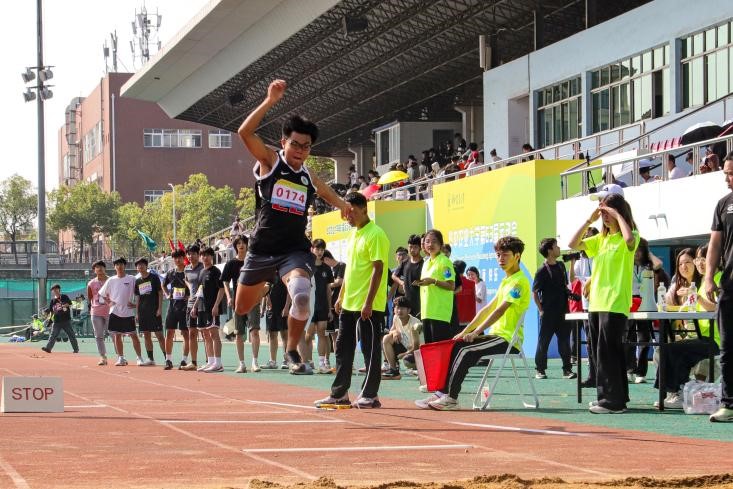 10月18日上午,学生男子组三级跳远决赛在第二运动场举行。资环院地信2401班孟启斌凌空一跃获得冠军。